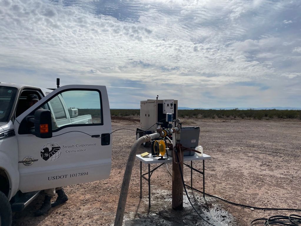 Straub Corporation Geoscience conducts a field-based groundwater pumping test using a fully equipped mobile setup, including flow monitoring instrumentation and real-time data logging.