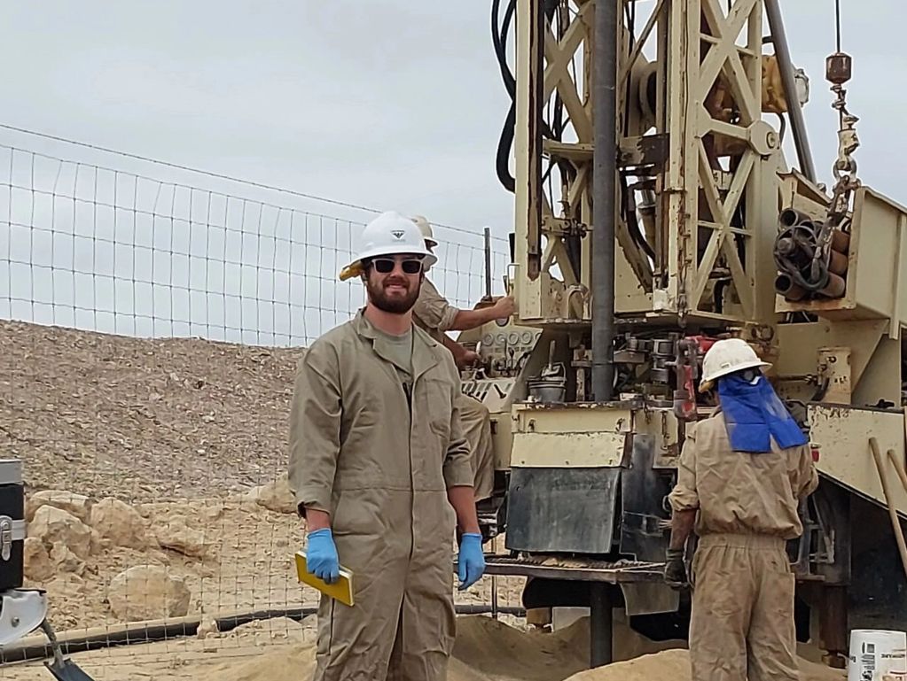 Staff Hydrogeologist Aaron Edwards, MS, GIT, stands in front of an active drilling rig, logbook in hand, overseeing well installation and subsurface data collection.